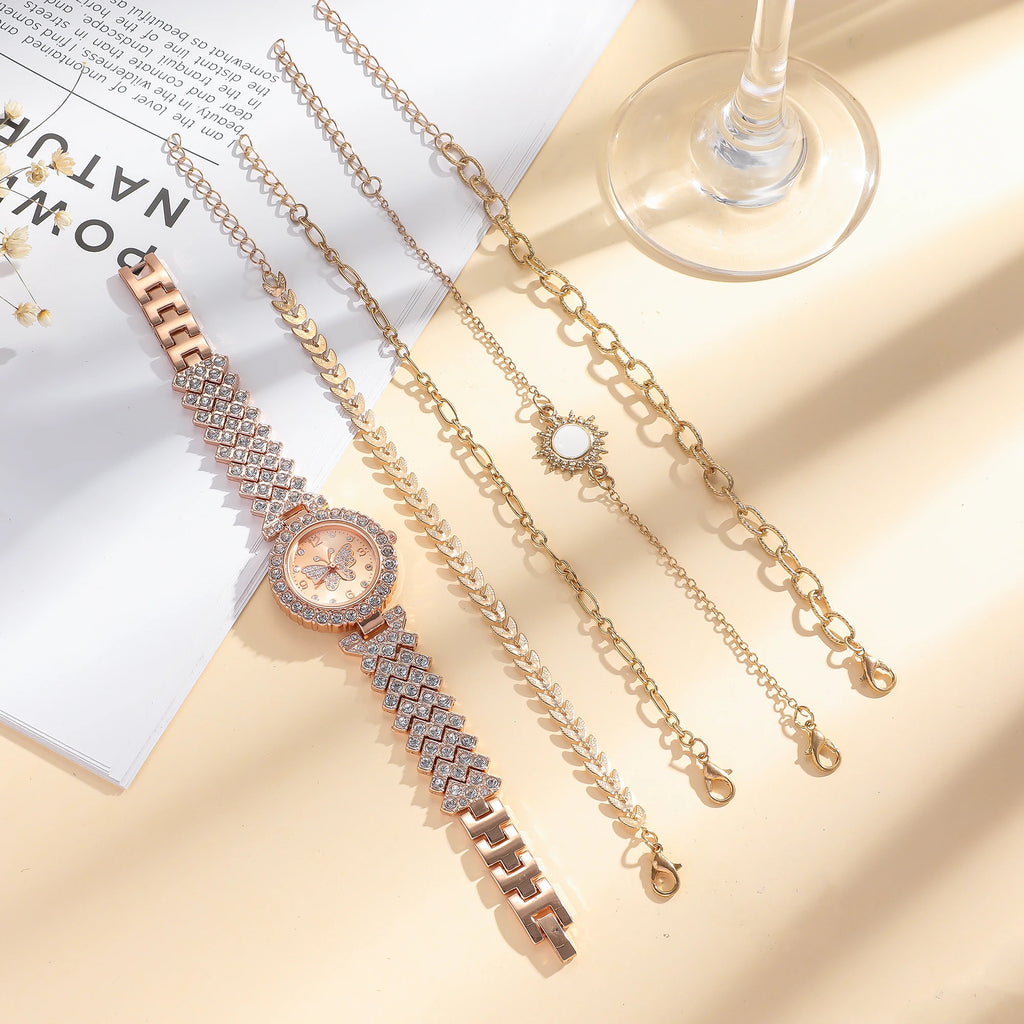 Este conjunto traz um relógio feminino de quartzo com mostrador estilizado em formato de borboleta, acompanhado por pulseiras decorativas que complementam qualquer look. Uma escolha charmosa para uso diário ou ocasiões especiais.