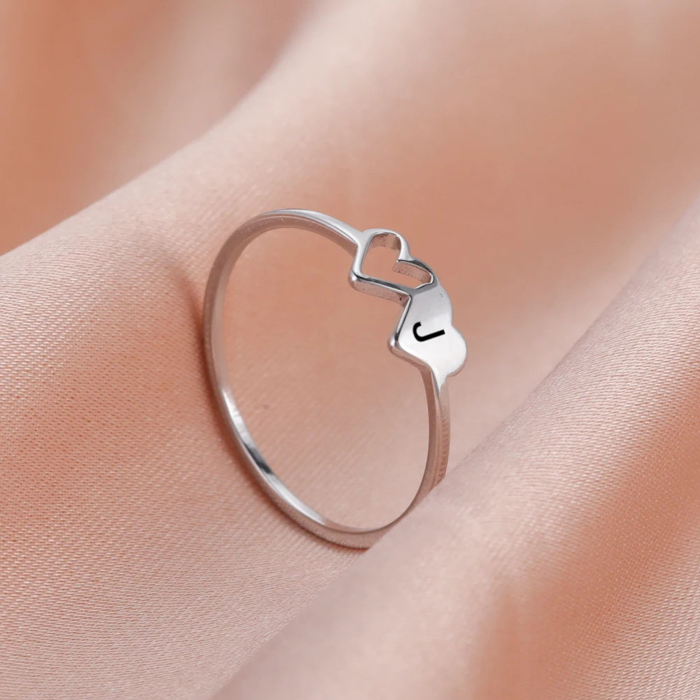 Este anel delicado une dois corações em um design moderno e personalizado, com a letra inicial gravada para simbolizar momentos únicos. Leve, versátil e elegante, é perfeito para expressar sentimentos em ocasiões especiais.