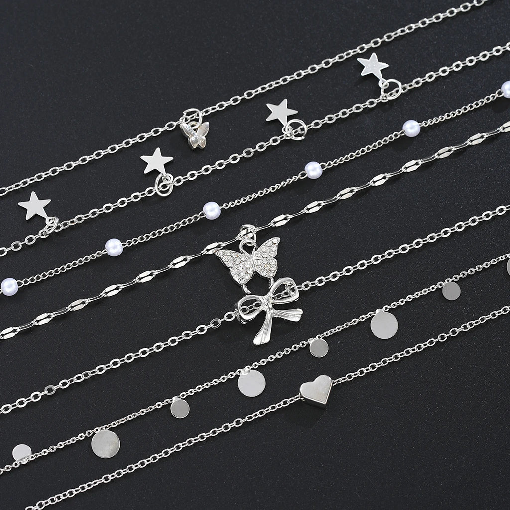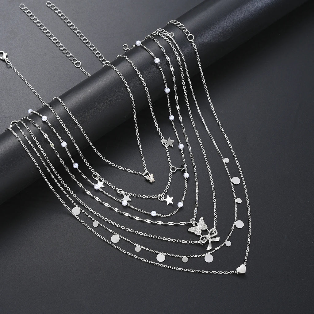 Conjunto de 7 Colares Femininos com Pingentes Estrela, Borboleta e Nó, Estilo Boho Elegante e Versátil