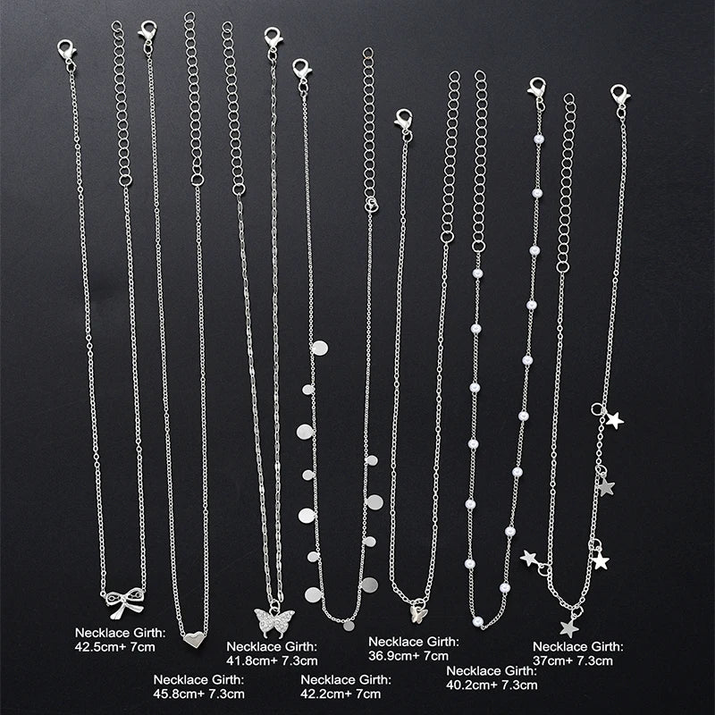 Este conjunto com 7 colares é perfeito para quem ama variedade e estilo. Com pingentes delicados em formato de estrela, nó e borboleta, traz charme romântico e moderno, ideal para compor produções criativas em diferentes ocasiões.